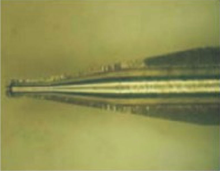 - 適用于點(diǎn)膠范圍較為狹窄的針頭,為了避免點(diǎn)膠時與 器件內(nèi)部碰撞,不改變針頭內(nèi)徑,將外徑縮小。一般 的針頭前端壁厚是50μm,細(xì)針頭最小可做到25μm, 能有效解決狹窄空間點(diǎn)膠難問題。