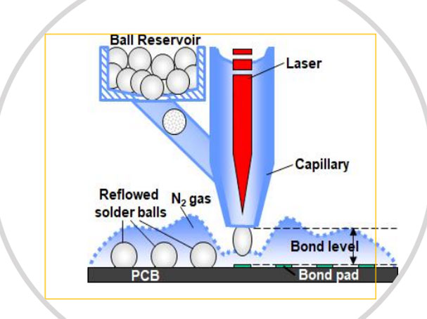 采用激光加熱錫球,并通過(guò)一定的壓力噴射到需要植球鍵合位置,是一種 新型植球技術(shù)。具有非接觸、無(wú)釬劑、熱量小、釬料精確可控等優(yōu)點(diǎn)。